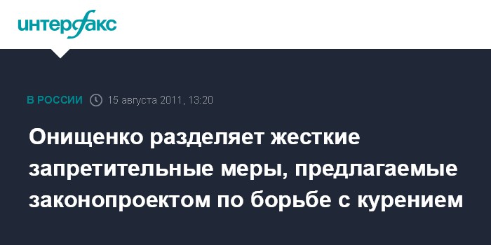 Москва. 15 августа. INTERFAX.RU - Руководитель Роспотребнадзора, главный государственный санитарный врач РФ Геннадий Онищенко поддерживает законопроект, запрещающий курение в большинстве публичных мест, и советует россиянам, страдающим никотиновой зависимостью, бросить курить.