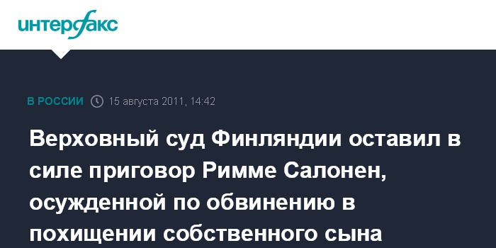 Хельсинки. 15 августа. INTERFAX.RU - Верховный суд Финляндии отклонил кассационную жалобу россиянки Риммы Салонен, которая потребовала пересмотреть решение суда города Тампере, приговорившего ее к полутора годам условно за похищение собственного сына, сообщил в понедельник портал телерадиовещания Финляндии YLE.