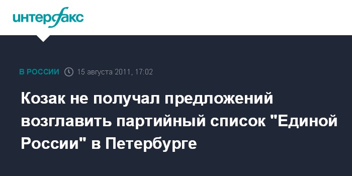 Санкт-Петербург. 15 августа. INTERFAX.RU - Вице-премьер РФ Дмитрий Козак уверяет, что к нему не поступало никаких предложений о возглавлении регионального списка партии "Единая Россия" в Госдуму от Петербурга.