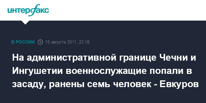Ростов-на-Дону. 15 августа. ИНТЕРФАКС-ЮГ - Глава Ингушетии Юнус-Бек Евкуров сообщил, что в результате нападения на бойцов Внутренних войск на административной границе Чечни и Ингушетии пострадали семь человек.