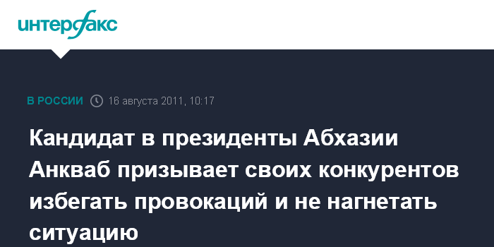 Сухуми. 16 августа. INTERFAX.RU - Кандидат в президенты Абхазии, и.о.президента Александр Анкваб призывает оппонентов не допустить повторения событий на выборах 2004 года, когда резко обострилось противостояние между двумя кандидатами на пост главы республики.