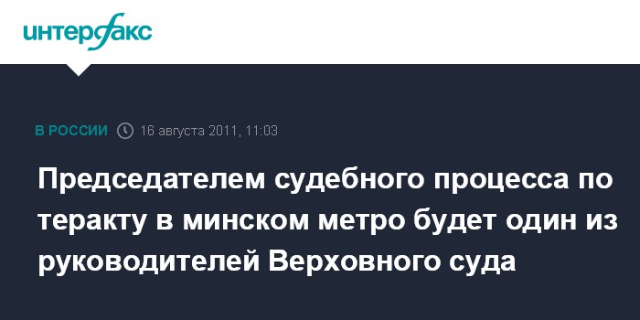 Минск. 16 августа. ИНТЕРФАКС-ЗАПАД - Один из руководителей Верховного суда Белоруссии будет председательствовать на процессе по уголовному делу о теракте в минском метро, сообщил председатель Верховного суда Валентин Сукало.