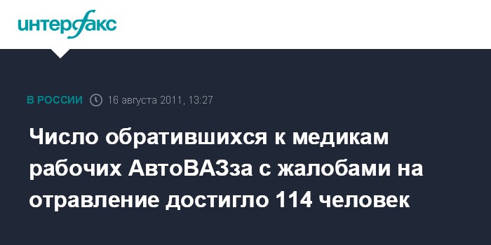 Самара. 16 августа. INTERFAX.RU - Управление Роспотребнадзора по городу Тольятти во вторник днем обнародовало информацию о 114 рабочих АвтоВАЗа, обратившихся к медикам с жалобами на отравление.