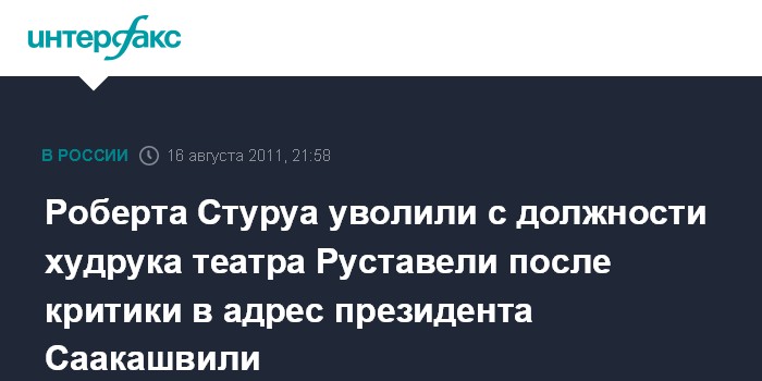 Тбилиси. 16 августа. INTERFAX.RU - Грузинский режиссер Роберт Стуруа приказом министра культуры Грузии Ники Руруа освобожден с должности художественного руководителя театра Руставели в Тбилиси. О снятии с должности Стуруа сообщил на своей странице на портале Facebook.