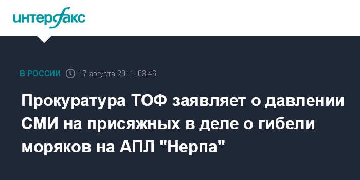 "С начала процесса по уголовному делу о гибели 20 членов сдаточной команды АПЛ "Нерпа", проходящего в закрытом режиме, в различных СМИ не прекращаются тенденциозные, не соответствующие действительности публикации", - заявляет в среду прокуратура ТОФ.