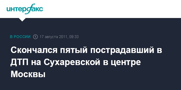 Москва. 17 августа. INTERFAX.RU - Еще один человек скончался от полученных травм в результате крупной автоаварии, произошедшей в среду утром на Садово-Сухаревской улице, сообщил "Интерфаксу" источник в медицинских кругах столицы.