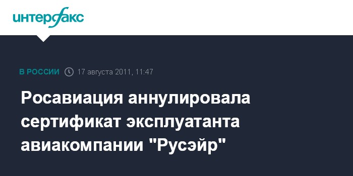 Москва. 17 августа. INTERFAX.RU - Росавиация, которая с 13 июля приостановила действие сертификата эксплуатанта авиакомпании "Русэйр", приняла решение аннулировать ее сертификат, сообщили "Интерфаксу" в среду в Росавиации.