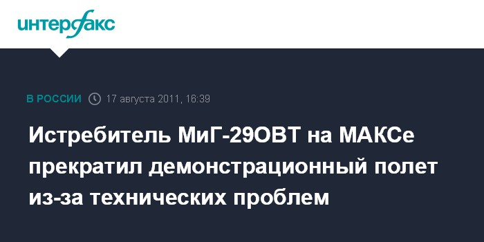 Жуковский (Московская область). 17 августа. INTERFAX.RU - Сверхманевренный истребитель МиГ-29ОВТ в среду не смог продемонстрировать в полете на авиасалоне МАКС-2011 свои качества, сообщил "Интерфаксу" источник, близкий к администрации авиасалона.