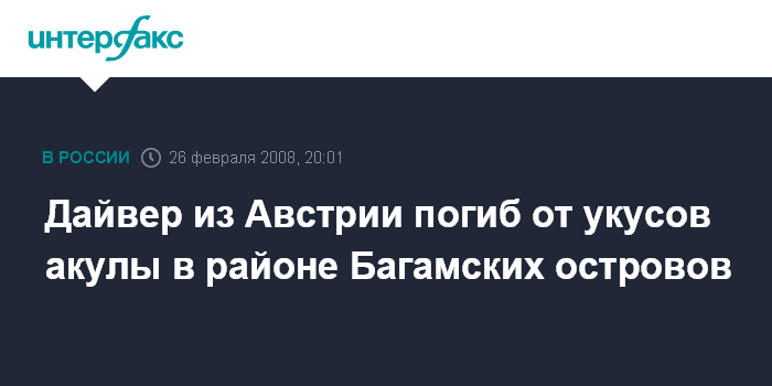 Нью-Йорк. 26 февраля. INTERFAX.RU - На австрийского дайвера недалеко от Багамских островов, в 50 милях от побережья Флориды напала акула.