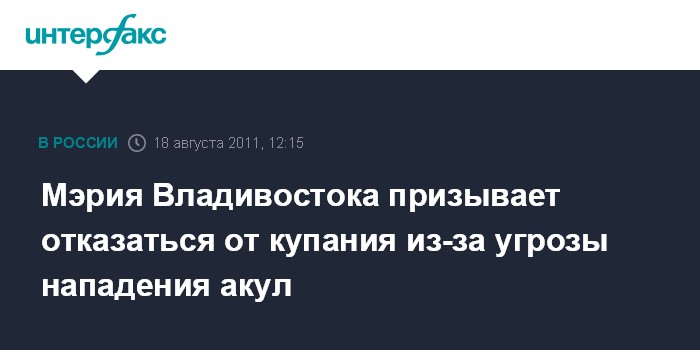 "Администрация города в связи со случаями нападения акул на людей рекомендует населению временно воздержаться от купания в море на территории Владивостокского городского округа", - говорится в сообщении, размещенном в четверг на официальном сайте мэрии.