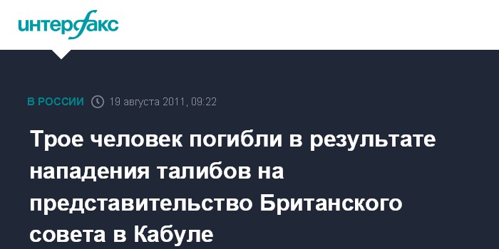 Лондон. 19 августа. INTERFAX.RU - Среди жертв нападения талибов на представительство Британского совета и британский культурный центр в Афганистане стали двое полицейских и один гражданский, сообщают представители полиции Кабула. Один боевик до сих пор находится внутри здания.
