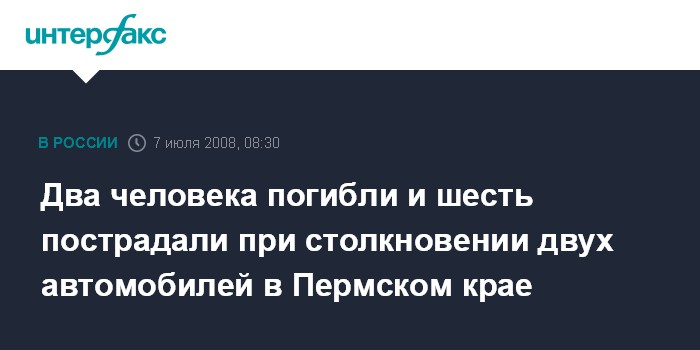 Москва. 7 июля. INTERFAX.RU - Столкновение двух легковых автомобилей на трассе в Пермском крае привело к гибели двоих человек, еще шестеро пострадали.