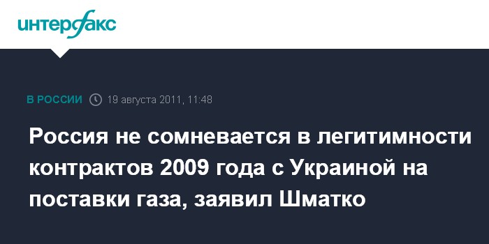 Москва. 19 августа. INTERFAX.RU - Россия не сомневается в легитимности контрактов 2009 года с Украиной на поставки газа, заявил министр энергетики РФ Сергей Шматко телеканалу RT.