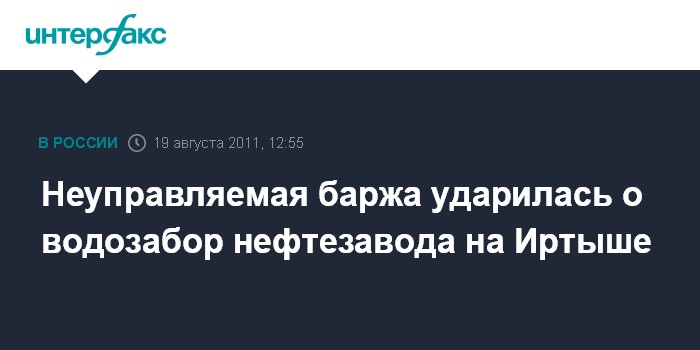 Омск. 19 августа. INTERFAX.RU - Сотрудникам омской полиции удалось остановить неуправляемую баржу, которая ударилась о сооружения водозабора Омского НПЗ, говорится в сообщении пресс-службы вневедомственной охраны регионального управления МВД. Инцидент произошел поздно вечером в среду, однако пресс-релиз о событии был распространен только в пятницу.