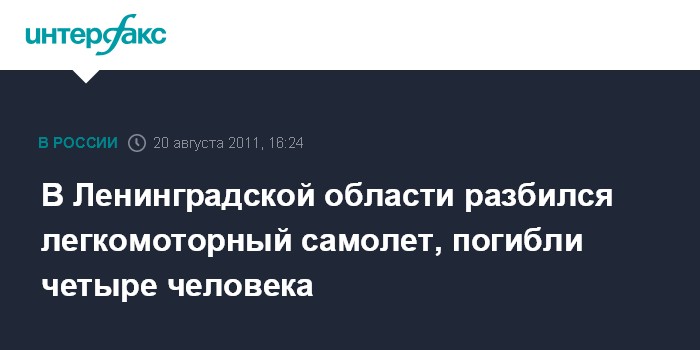 "Авиакатастрофа произошла в 50 км от Петербурга, в районе населенного пункта Ропша. Легкомоторный самолет предположительно модели "СТ-21" потерпел катастрофу, в результате которой погибли четыре человека, находившиеся на борту", - отметил собеседник агентства.