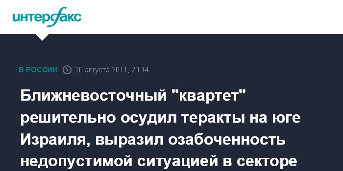 Москва. 20 августа. ИНТЕРФАКС - Ближневосточный "квартет" международных посредников (ООН, Россия, США, ЕС) самым решительным образом осудил произошедшие 18 августа нападения на юге Израиля и все теракты.