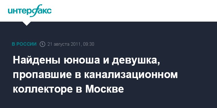 Москва. 21 августа. INTERFAX.RU - Спасатели нашли пропавших в канализационном коллекторе в Москве, сообщил "Интерфаксу" утром в воскресенье источник в правоохранительных органах. По его данным, девушку и юношу в 7:57 мск обнаружила поисковая группа в одном из коллекторов в районе улицы Грузинский вал. "Спасатели подняли девушку и юношу на поверхность. Для осмотра их состояния на место вызваны медики", - сказал собеседник агентства. На вид они не пострадали, добавил он.