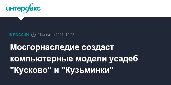 Москва. 21 августа. INTERFAX.RU - Создать трехмерные цифровые модели ряда объектов культурного наследия намерен московский департамент культурного наследия (Мосгорнаследие) к концу 2011 года. Как сообщил "Интерфаксу" источник в департаменте, среди объектов, в частности, ансамбли усадеб "Кузьминки" и "Кусково", Мариинская больница на улице Достоевского (СВАО) и усадьба "Грачевка" на Клинской улице (САО).