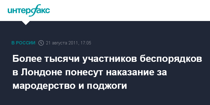 Москва. 21 августа. INTERFAX.RU - Лондонская полиция задержала 1875 человек в связи с массовыми беспорядками. На данный момент более тысячи из них предъявлены обвинения в мародерстве и организации поджогов, сообщает телерадиокорпорация ВВС в воскресенье. Как сообщает Скотланд-Ярд, в Бирмингеме, Ливерпуле и Манчестере задержаны еще 900 человек.