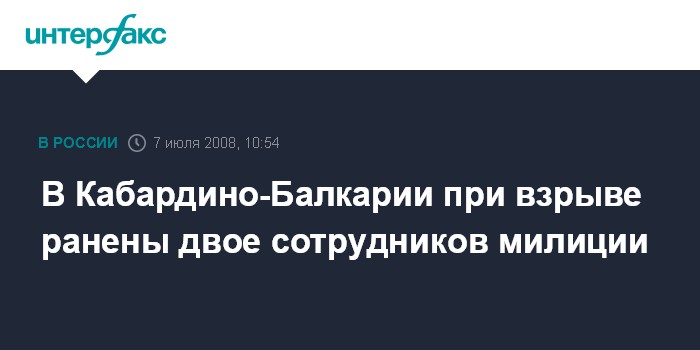 Москва. 7 июля. INTERFAX.RU - В Кабардино-Балкарии в результате взрыва самодельного взрывного устройства получили ранения двое сотрудников ДПС Чегемского РОВД, сообщил в понедельник агентству "Интерфакс-Юг" прокурор Эльбрусского района Валерий Кануков.