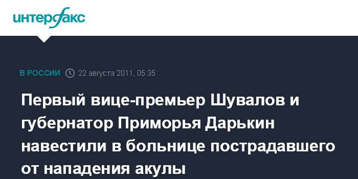 Собеседник агентства отметил, что И.Шувалов и С.Дарькин посетили районную больницу, где сейчас находится 25-летний Денис Удовенко, пострадавший от нападения акулы.