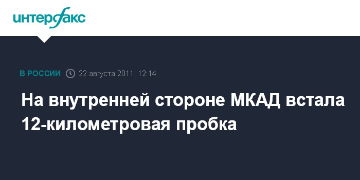 Москва. 22 августа. INTERFAX.RU – На внутренней стороне Московской кольцевой автодороги (МКАД) сформировался 12-километровый затор, скорость движения автотранспорта в котором не превышает 10 км/ч.
