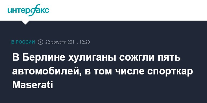 Берлин. 22 августа. INTERFAX.RU - Неизвестные в ночь на понедельник сожгли пять автомобилей в районах Митте и Веддинг в центре Берлина и в районе Шарлоттенбург в западной части города, сообщает немецкий журнал Stern.