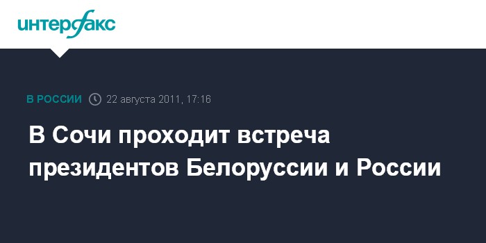 Минск. 22 августа. INTERFAX.RU - Встреча президентов Белоруссии и России Александра Лукашенко и Дмитрия Медведева проходит в Сочи, сообщил агентству "Интерфакс-Запад" руководитель пресс-службы главы белорусского государства Павел Легкий.