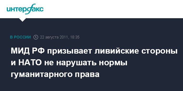 Москва. 22 августа. INTERFAX.RU - В Москве рассчитывают, что все стороны в Ливии будут придерживаться норм международного гуманитарного права, заявил уполномоченный МИД РФ по вопросам прав человека, демократии и верховенства права Константин Долгов.
