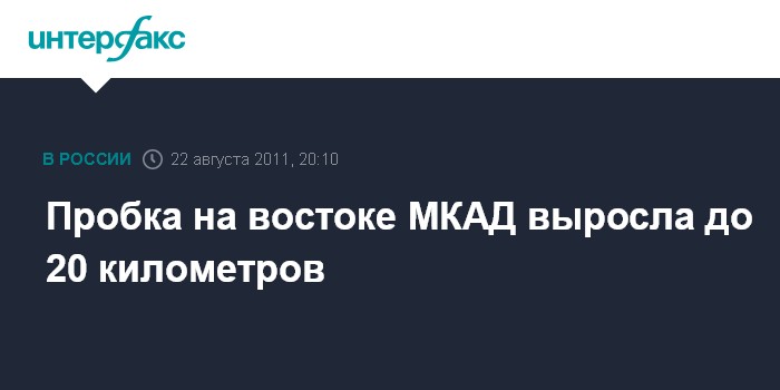 Москва. 22 августа. INTERFAX.RU – Пробка на востоке МКАД на внутренней стороне кольца выросла до 20 километров, таким образом, она держится уже более 12 часов. Как сообщил ведущий аналитик "Яндекс.Пробок" Леонид Медников, причина такого затора, помимо строительных работ на этом участке, которые затрудняют движение, в том, что на МКАД произошло два ДТП. "Первое из них случилось в 12:40 в районе Дзержинского — пробка быстро выросла до развязки с Рязанским проспектом. В результате общая длина пробки составила 22 км. К 15 часам движение после развязки с Рязанским проспектом восстановилось — пробка снова сократилась до 11 км. Однако в 16:50 произошло еще одно ДТП — недалеко от развязки с Волгоградским проспектом, и снова две пробки соединились", - говорится в официальном письме от "Яндекса", поступившем в понедельник в "Интерфакс".