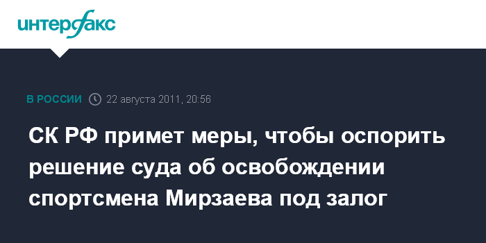 Москва. 22 августа. INTERFAX.RU - СК РФ инициирует обжалование решения суда, освободившего под залог спортсмена Расула Мирзаева, сообщил "Интерфаксу" официальный представитель Следственного комитета Владимир Маркин.