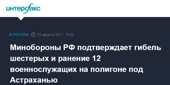 Москва.23 августа. INTERFAX.RU - Шесть военнослужащих погибли, 12 получили ранения в результате взрыва боеприпасов при их утилизации на полигоне Ашулук в Астраханской области, сообщил "Интерфаксу-АВН" во вторник официальный представитель Минобороны РФ.