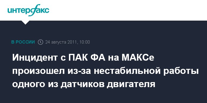 Москва. 24 августа. INTERFAX.RU - Во время демонстрационного полета в последний день авиасалона МАКС-2011 произошел не отказ, а сбой в работе автоматики силовой установки истребителя пятого поколения, заявляют в НПО "Сатурн", являющемся разработчиком двигателя, установленного на перспективном авиационном комплексе фронтовой авиации (ПАК ФА).