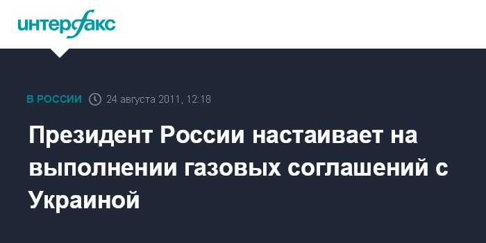 Улан-Удэ. 24 августа. INTERFAX.RU - Президент РФ Дмитрий Медведев заявил, что действующее газовое соглашение с Украиной должно исполняться, при этом не исключив в будущем в этой сфере различных вариантов, которыми украинская сторона должна заинтересовать российскую.