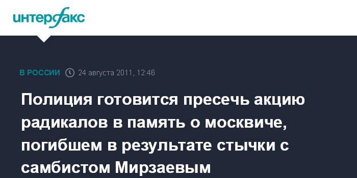 Москва. 24 августа. INTERFAX.RU - Правоохранительные органы располагают информацией о готовящейся после футбольного матча "Спартак-ЦСКА" в Москве акции группы молодежи в связи со смертью москвича Ивана Агафонова в результате конфликта чемпионом мира по смешанным единоборствам Расулом Мирзаевым.