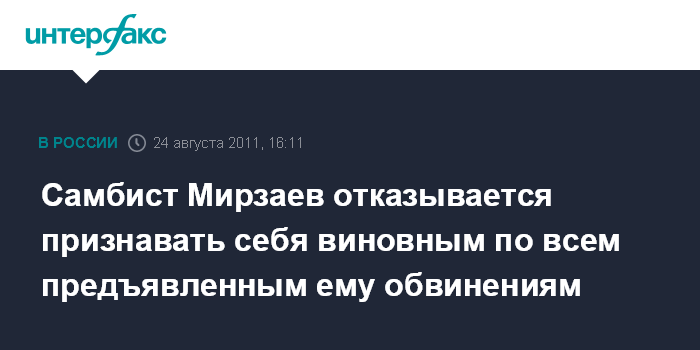 Москва. 24 августа. INTERFAX.RU - Чемпион мира по самбо Расул Мирзаев после предъявления ему обвинения в нанесении смертельных побоев 19-летнему Ивану Агафонову отказался от признания вины в совершении данного преступления.