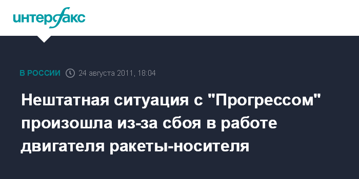 "24 августа при запуске ракеты-носителя "Союз-У" с транспортным грузовым кораблем "Прогресс М-12М" в ходе работы третьей ступени на 325-й секунде полета ракеты-носителя, по предварительным данным, произошло нарушение работы двигательной установки, приведшее к ее аварийному отключению", - говорится в сообщении, размещенном на сайте Роскосмоса.
