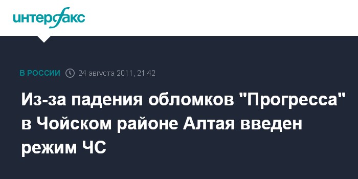 Барнаул. 25 августа. INTERFAX.RU - Режим чрезвычайной ситуации введен в Чойском районе республики Алтай, где предположительно упали обломки космического корабля "Прогресс", сообщил агентству "Интерфакс-Сибирь" источник в органах муниципальной власти.