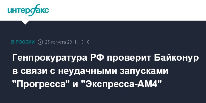 Москва. 25 августа. INTERFAX.RU - Генпрокуратура РФ организовала проверку по фактам падения космического корабля "Прогресс М-12М" и невывода на орбиту космического аппарата "Экспресс-АМ4".