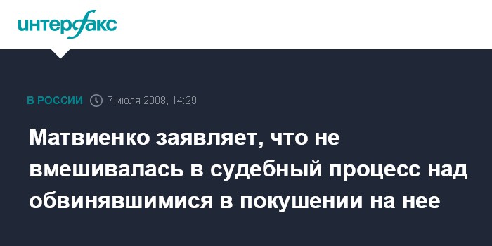 Москва. 7 июля. INTERFAX.RU - Губернатор Петербурга Валентина Матвиенко заявляет, что отстраненно и "не вмешиваясь" наблюдала за судебным процессом над обвинявшимися в подготовке покушения на нее.