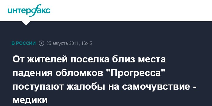 Москва. 25 августа. INTERFAX.RU - Восемь жителей Чойского района республики Алтай, где ранее упали обломки транспортного корабля "Прогресс", обратились к медикам за помощью с жалобами на гипертонию, першение в горле и температуру, сообщили "Интерфаксу" в больнице поселка Каракокша. "Люди к нам обращаются с жалобами на давление, першение в горле, температуру и недомогание. Среди обратившихся есть и сотрудники нашей больницы. У всех людей одинаковые симптомы", - отметил представитель больницы.