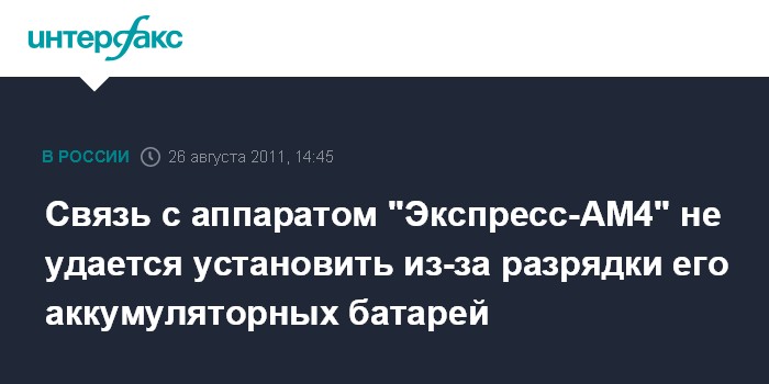 Москва. 26 августа. INTERFAX.RU - Российский телекоммуникационный спутник "Экспресс-АМ4", скорее всего, не выходит на связь из-за разрядки аккумуляторных батарей, сообщил "Интерфаксу-АВН" в пятницу источник в ракетно-космической отрасли.