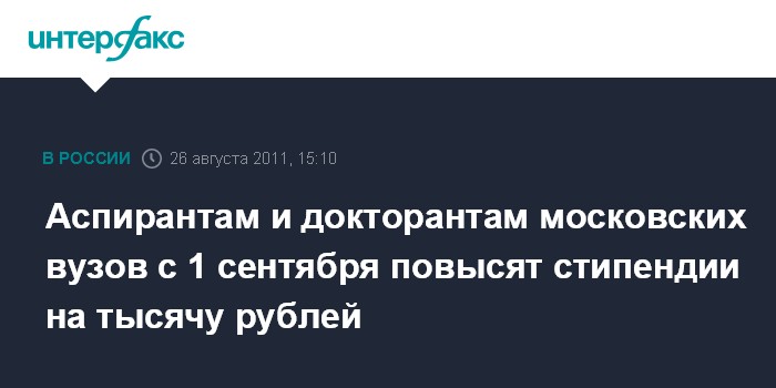 Аналогичное решение о повышении стипендий с 1 сентября 2011 года аспирантам и докторантам федеральных образовательных учреждений принято правительством РФ в конце прошлого года.
