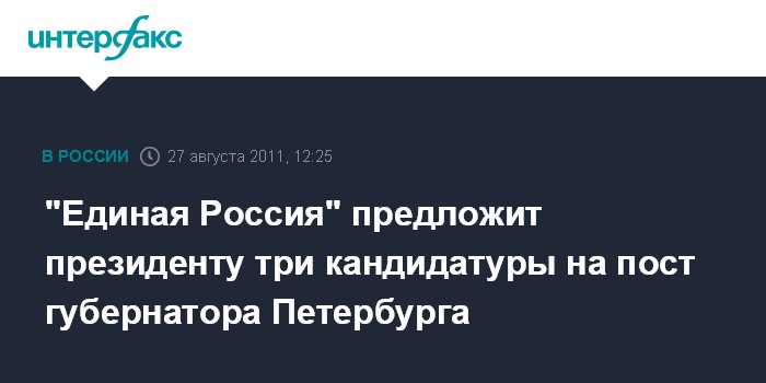 Москва. 27 августа. INTERFAX.RU - "Единая Россия" внесет на рассмотрение президента РФ три кандидатуры на пост губернатора Санкт-Петербурга, в том числе ныне исполняющего обязанности губернатора Георгия Полтавченко, сообщил в субботу председатель высшего совета "Единой России", спикер Госдумы Борис Грызлов.