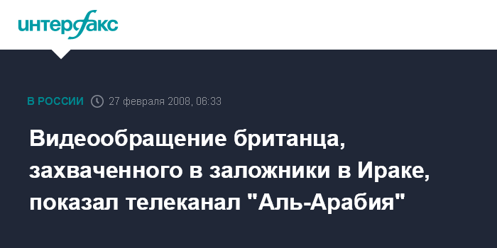 Дубай. 26 февраля. INTERFAX.RU - Спутниковый телеканал "Аль-Арабия" показал во вторник видеообращение одного из пяти британцев, захваченных в заложники в Ираке в мае 2007 года.