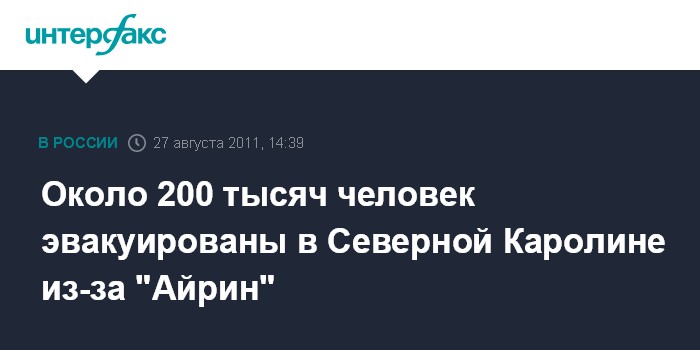 Лондон. 27 августа. INTERFAX.RU - Власти США провели эвакуацию уже 200 тысяч жителей штата Северная Каролина из-за приближения урагана "Айрин", сообщает в субботу на своем веб-сайте британская газета "Дейли телеграф". Местных жителей предупредили, что из-за "Айрин" на побережье могут обрушиться волны высотой более трех метров. Кроме того, тысячи людей спешно покидают опасные районы в штатах Мэриленд, Делавэр, Нью-Джерси, а также Нью-Йорк, говорится в сообщении.