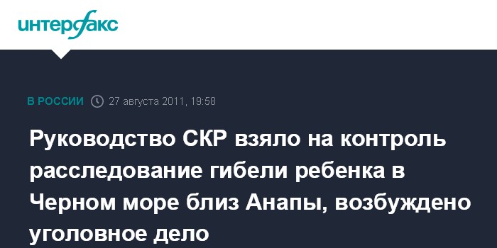 Москва. 27 августа. INTERFAX.RU- По факту происшествия в акватории Черного моря, в результате которого погиб 9-летний мальчик возбуждено уголовное дело, дело взято на контроль руководством СКР.