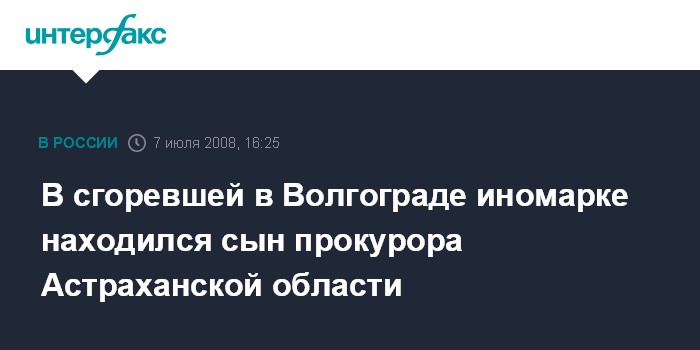 Москва. 7 июля. INTERFAX.RU - В автомобиле, загоревшемся из-за столкновения со световой опорой, находился сын прокурора Астраханской области, руководитель департамента потребительского рынка администрации Волгограда Роман Волколупов, сообщили агентству "Интерфакс" в правоохранительных органах Волгограда.