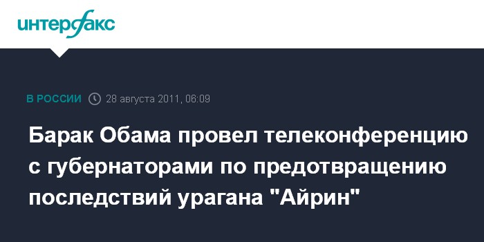 Вашингтон. 28 августа. ИНТЕРФАКС - Президент США Барак Обама провел в субботу видео телеконференцию с губернаторами и руководством агентства по чрезвычайным ситуациям для обсуждения мер, предпринимаемых по предотвращению возможных последствий урагана "Айрин", информирует пресс-служба Белого дома.