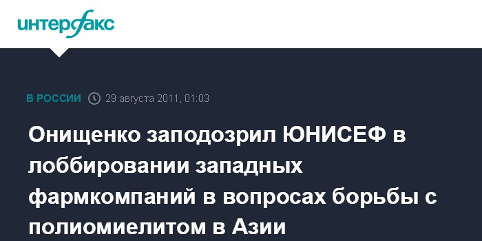 Онищенко заподозрил ЮНИСЕФ в лоббировании западных фармкомпаний в вопросах борьбы с полиомиелитом в Азии